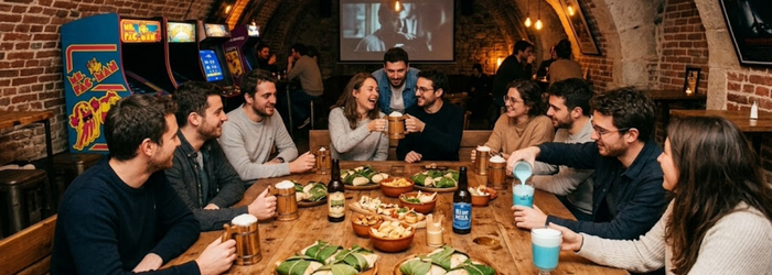 Imagine une immense table en bois brut, sous les voûtes centenaires de l’ancienne fonderie. Autour d’elle, les rires se mêlent au cliquetis des manettes. Ce n’est pas qu’un repas, c’est un raid gastronomique. Ici, on partage ses victoires, ses théories sur le dernier film culte, et surtout, des saveurs qui n’existaient jusqu’alors que sur vos écrans.